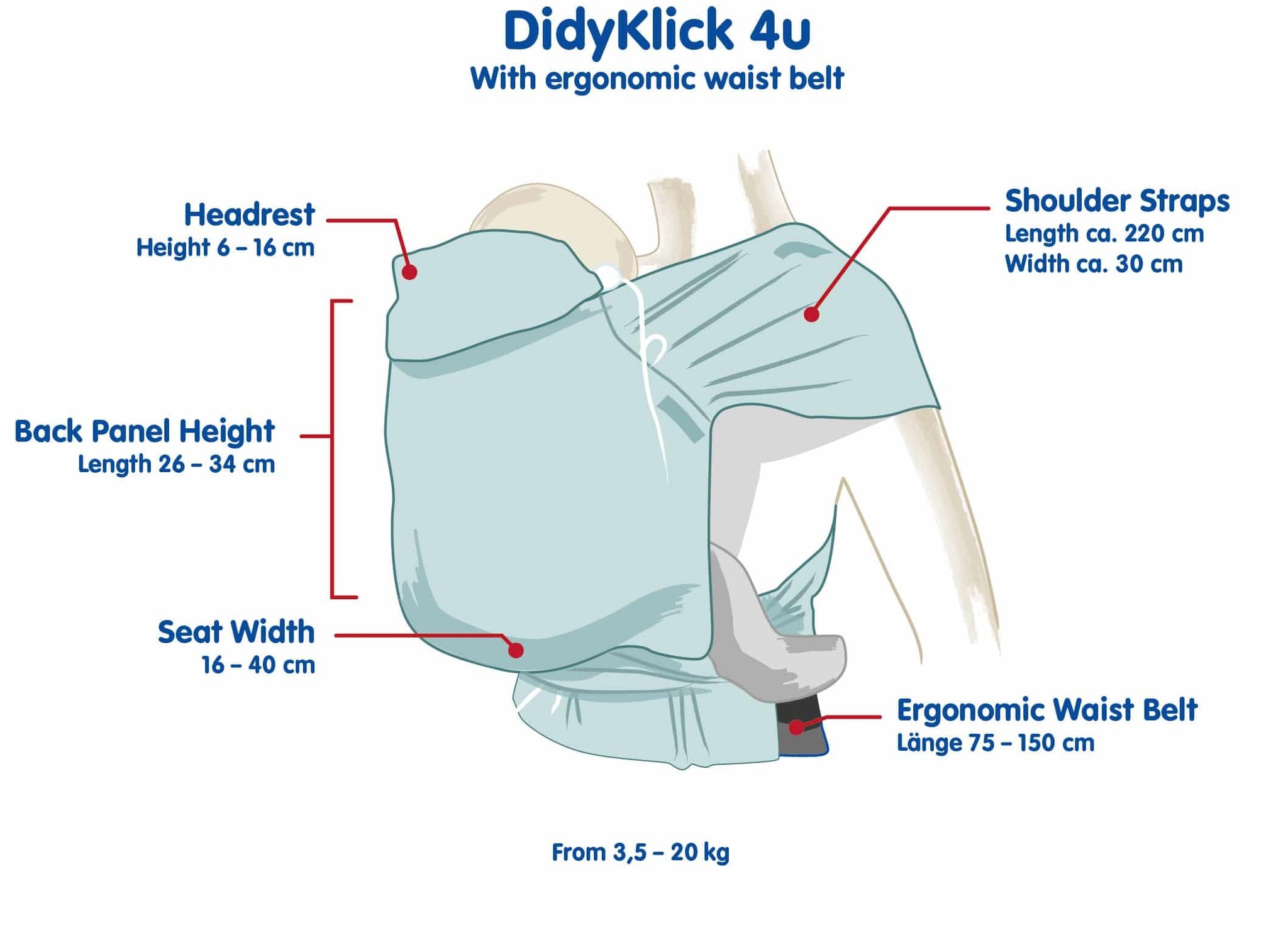 Dankzij het verstelbare rugpand groeit de draagzak eenvoudig met je kindje mee. Je kunt de DidyKlick gebruiken vanaf je pasgeboren baby en vaak nog comfortabel tot in de peutertijd.
