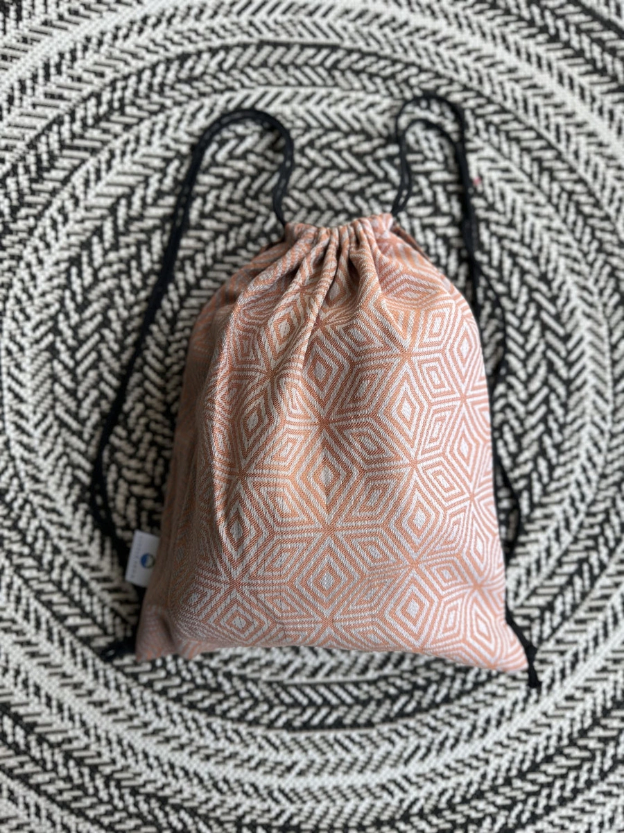 Draagtasje van draagdoekenstof is 34 cm x 40 cm groot, net een maatje groter dan de kleine tasjes van Little Frog. Gemaakt van katoenen draagdoekenstof.
