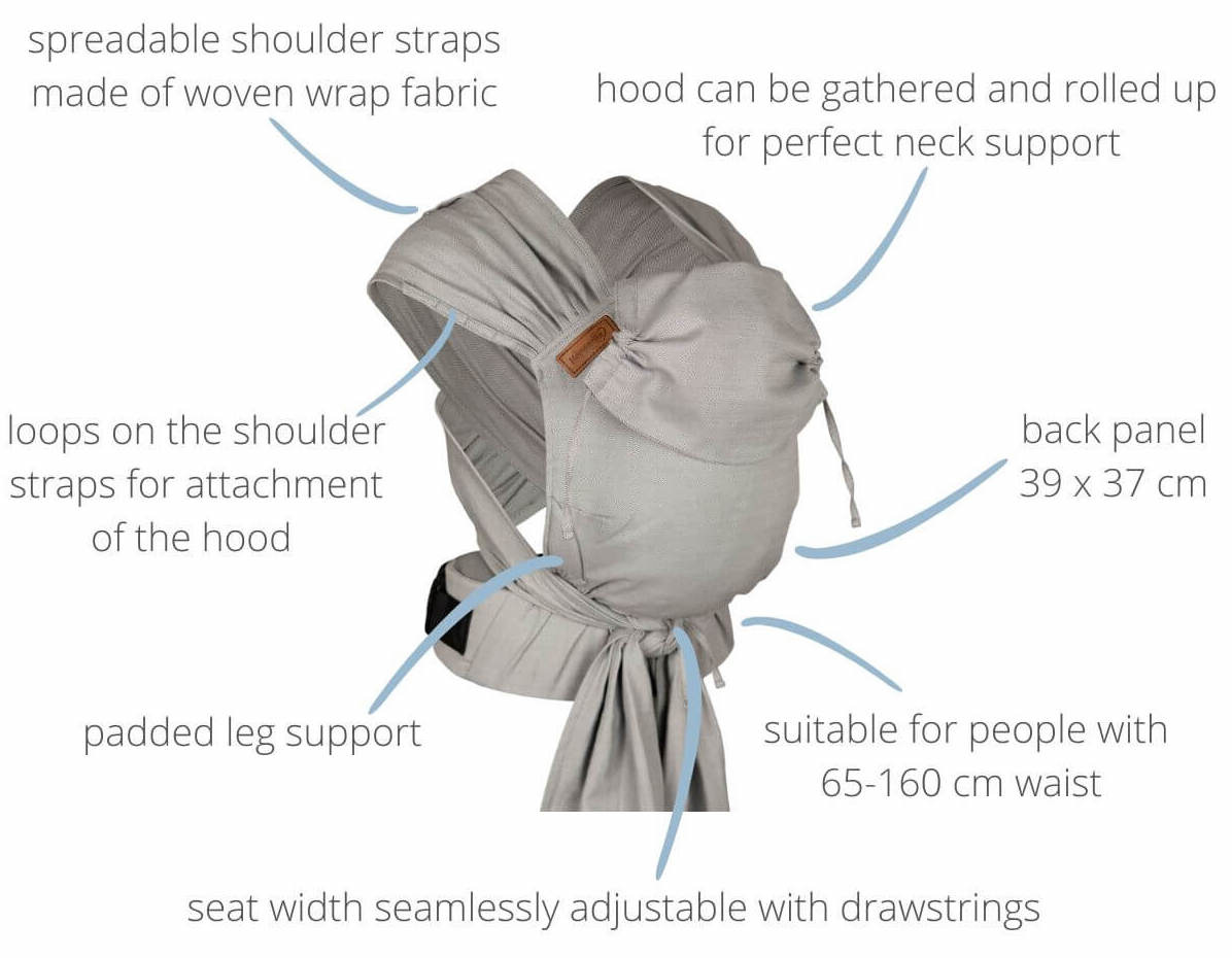 Door de fijne mix van draagzak en draagdoek heb je de voordelen van een draagzak en het gevoel van een doek. De brede schouderbanden (25cm) geven je steun op je rug en verdeelt het gewicht over je schouders. De schouderbanden zijn (220cm) lang, zodat je ook nog op verschillende manieren kunt afknopen.