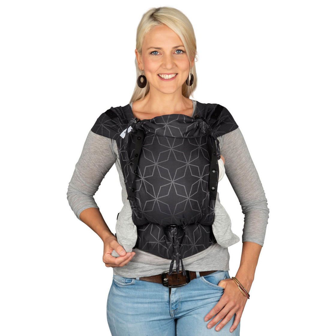 De Hoppediz Primeo is een verstelbare, draagzak die je al kunt gebruiken vanaf een kleine maat 50 tot maat 86. Extra fijn: je kunt eerst de draagzak omdoen en alle gespen vastmaken, en dan pas je baby erin zetten. Ideaal als je onderweg bent, of als het koud is buiten! Natuurlijk kun je hem ook omdoen op de klassieke manier, waarbij je het rugpand over je baby heentrekt en dan de gespen vastmaakt.