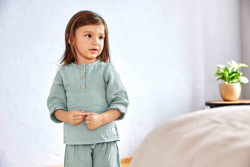 Muslin staat bekend om zijn lichte, ademende structuur. De stof bestaat uit meerdere dunne lagen katoen, waardoor het shirt luchtig draagt en tegelijkertijd stevig genoeg is voor dagelijks gebruik. En het mooie: na iedere wasbeurt wordt de stof nóg zachter.