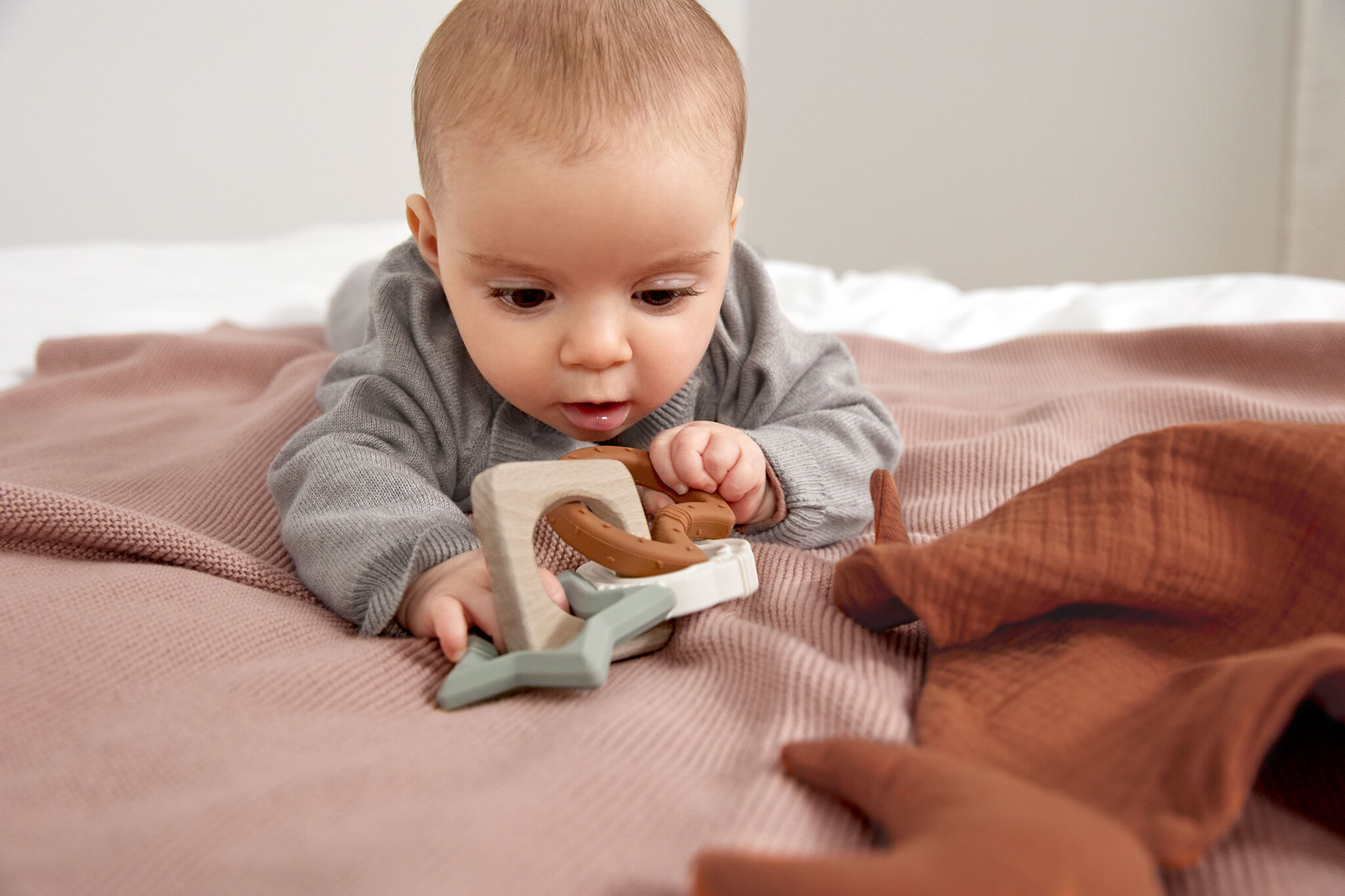 Door te spelen, voelen en ontdekken wordt de fijne motoriek op een speelse manier ontwikkeld. Beweeg het speeltje voor je kindje om de oog-handcoördinatie te stimuleren en het grijpen te bevorderen. Dankzij het formaat en de gebruikte materialen ligt het speeltje perfect in kleine handjes. De zachte bijtring biedt bovendien verlichting bij doorkomende tandjes.
