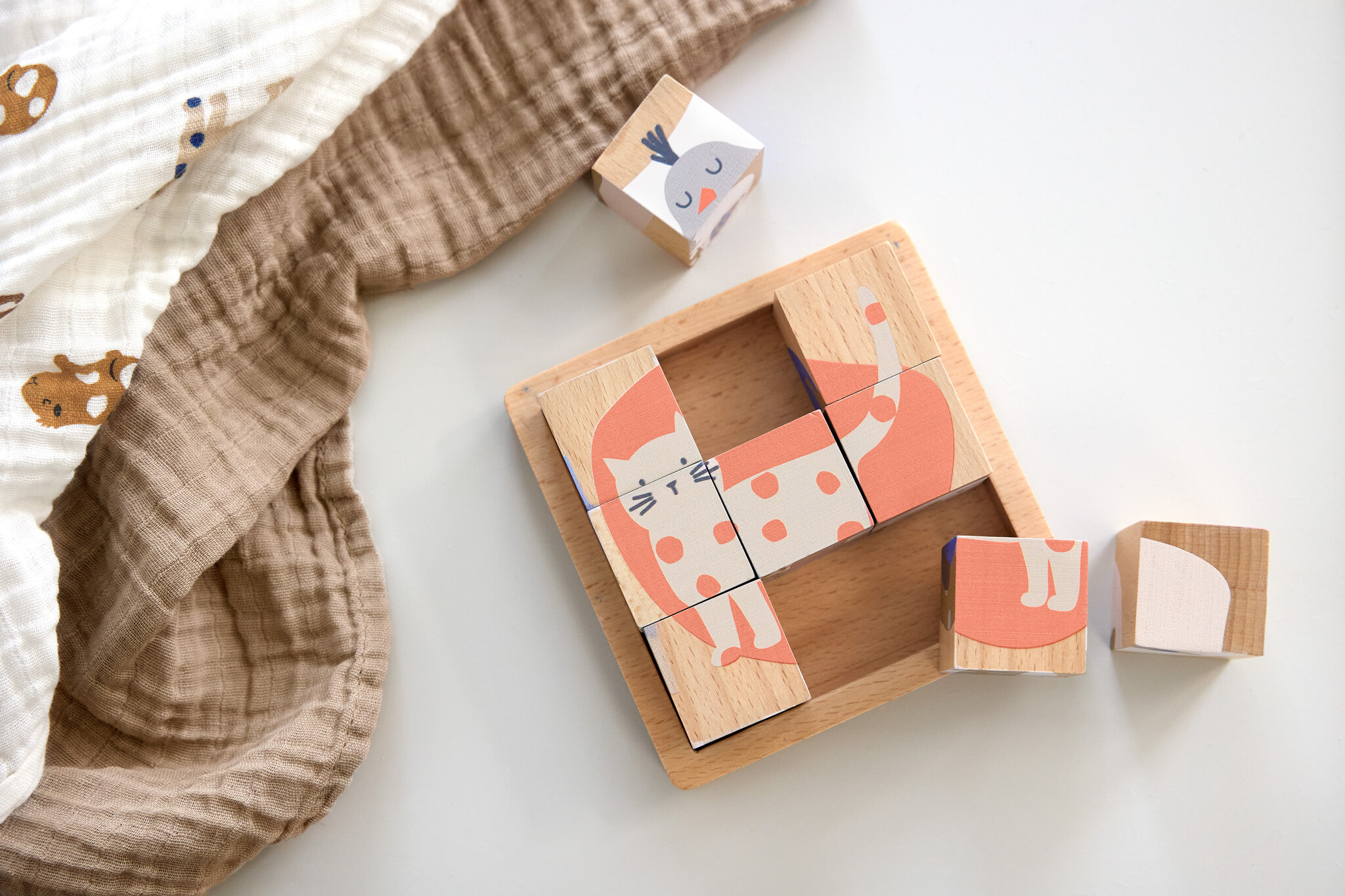 De LÄSSIG houten blokkenpuzzel met negen blokjes en zes verschillende dierenmotieven zorgt voor uren speelplezier én stimuleert de fijne motoriek en concentratie van je kindje. Het principe is eenvoudig maar uitdagend: door de blokjes te draaien verschijnen steeds nieuwe, schattige dierenafbeeldingen. Naast puzzelen is het ook superleuk stapelspeelgoed.