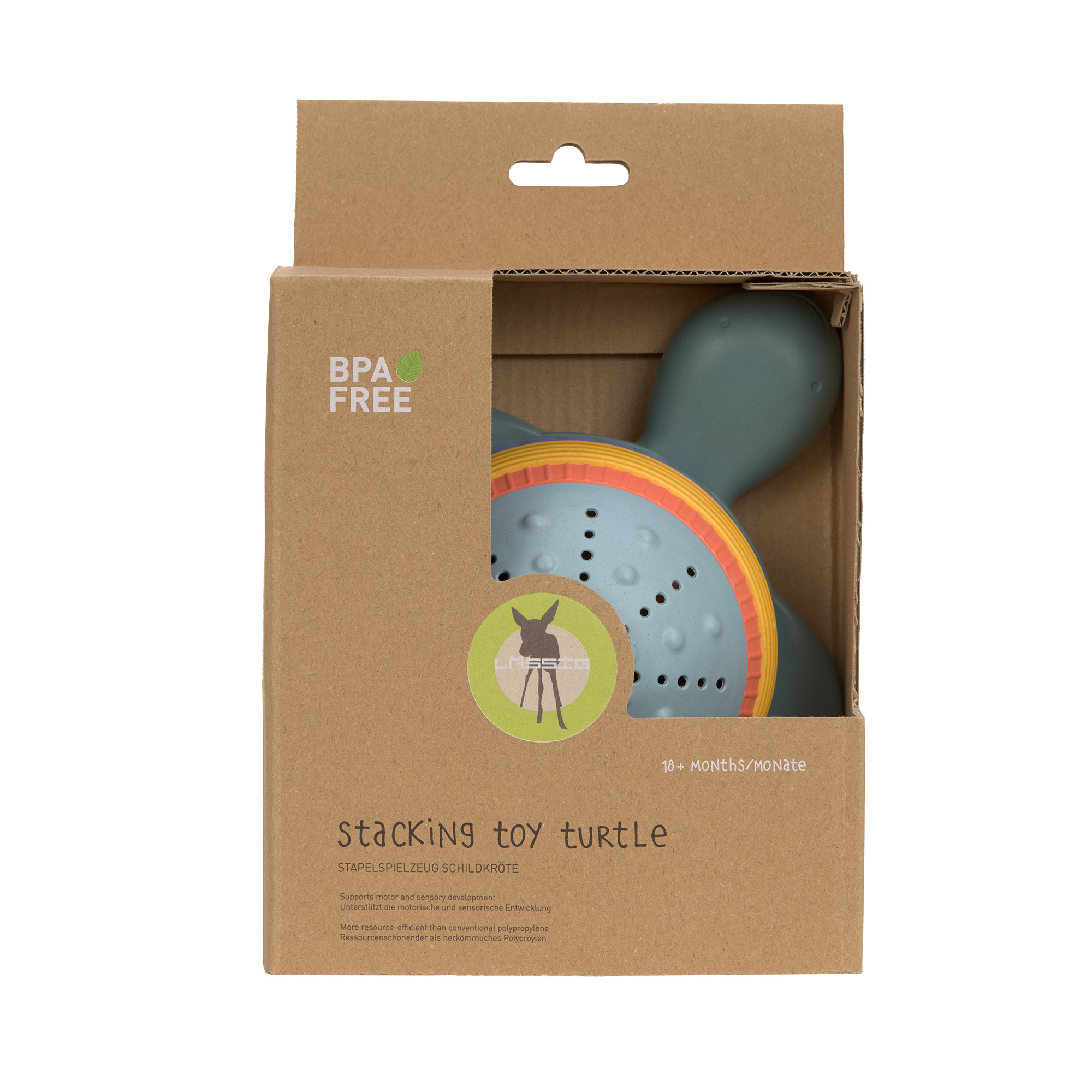 Het LÄSSIG Stacking Toy Turtle Green is gemaakt van een biocomposiet (70% polypropyleen, 30% cellulose), een duurzamer alternatief voor conventioneel kunststof. Een vrolijke toevoeging aan de andere LÄSSIG strandspeeltjes.