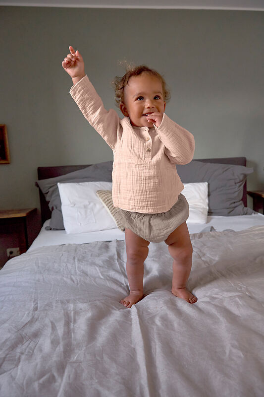 De longsleeve heeft een losse, comfortabele pasvorm, zodat je kindje alle ruimte heeft om te spelen, kruipen en ontdekken. Dankzij de knopen aan de voorkant trek je het shirt gemakkelijk aan en uit – wel zo handig bij de allerkleinsten.