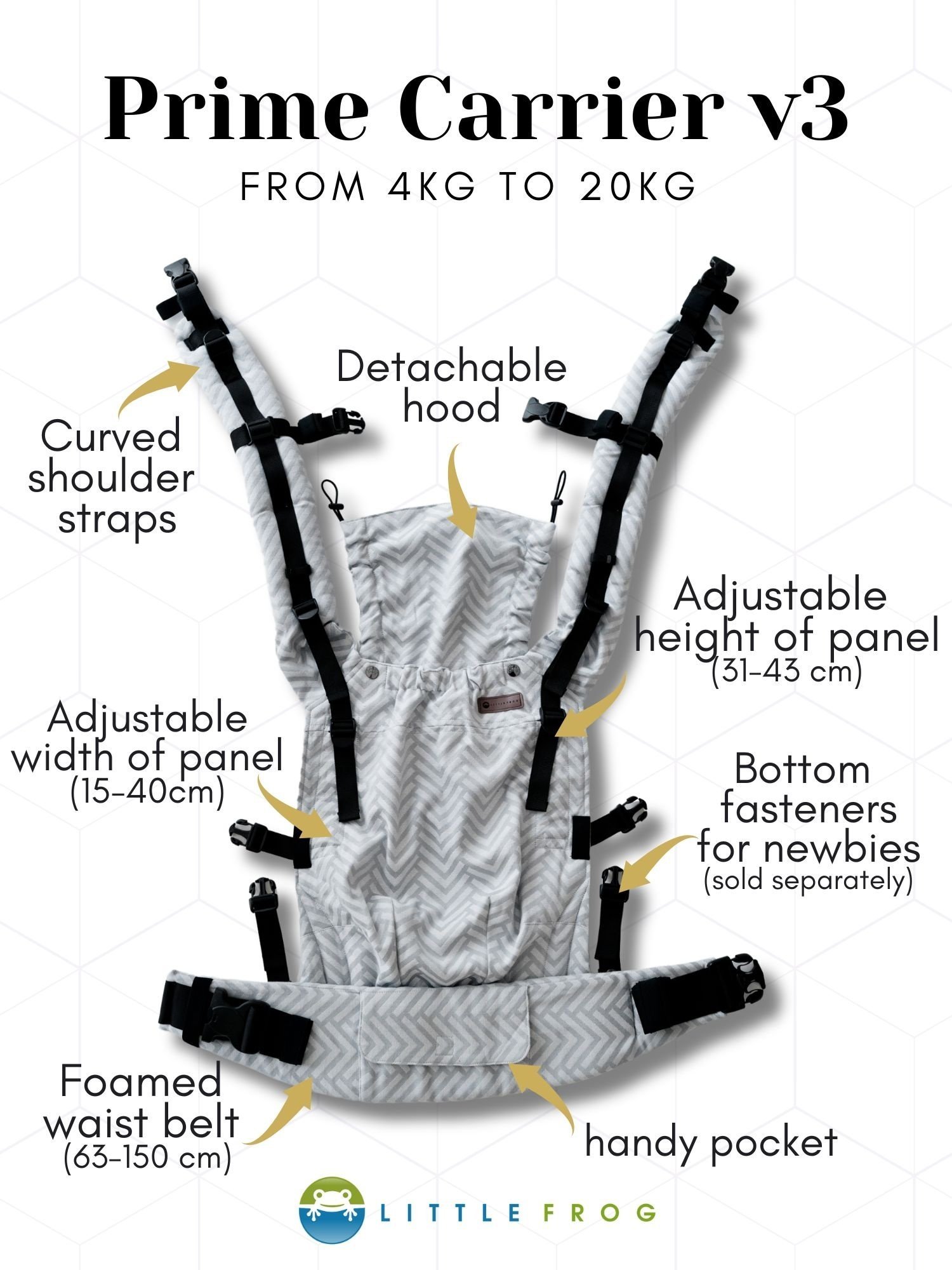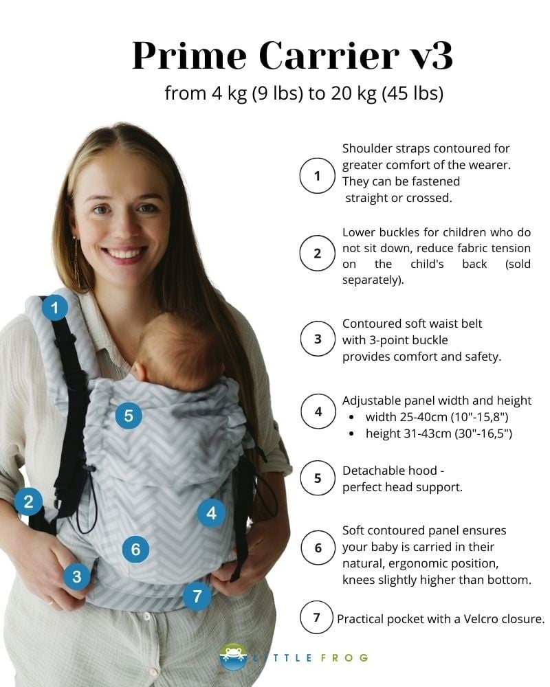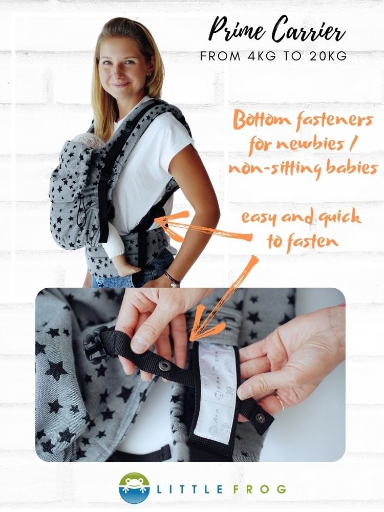 De Little Frog Prime is verstelbaar in breedte en hoogte en past daardoor al vanaf ongeveer broekmaat 56 tot maat 86/92. Dat maakt deze draagzak geschikt voor kleine baby’s, maar ook voor grotere kindjes die nog graag gedragen worden. Ideaal dus als je een draagzak zoekt waar je langere tijd plezier van hebt.