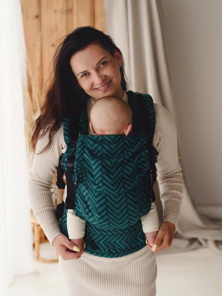 Hij is gemaakt van Little Frog draagdoekenstof, en daardoor heel zacht en comfortabel. Met 2 bevestigingspunten. De schouderbanden aan de tailleband voor hele jonge baby's, zodat er minder druk op het ruggetje komt. Als ze groter worden, kun je de schouderbanden aan het rugpand vastmaken.