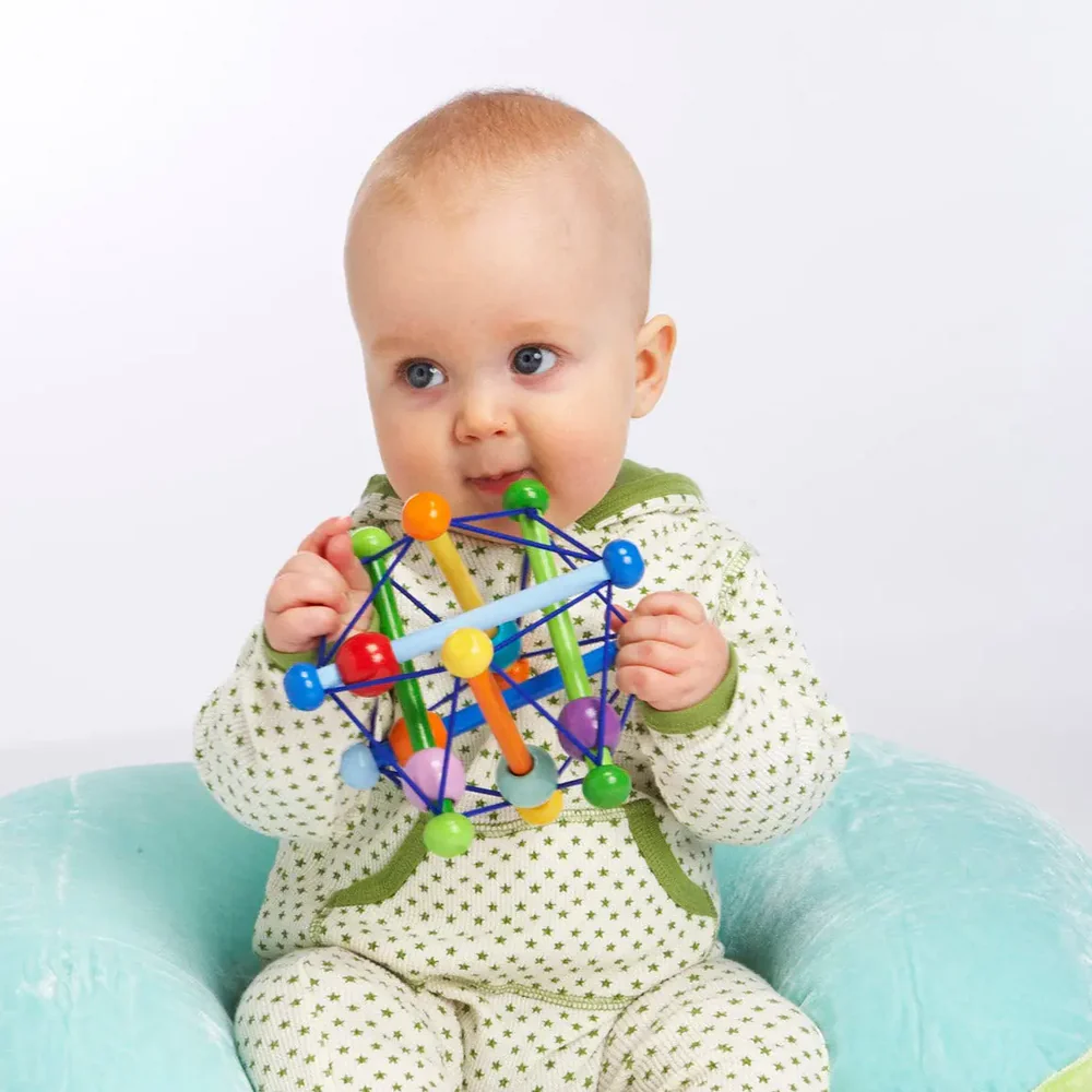 De Skwish is niet zomaar een speeltje – het is een echte klassieker die generaties lang meegaat. Deze kleine, samendrukbare rammelaar en bijtring is gemaakt van duurzaam rubberhout en stevig elastiek, waardoor hij telkens weer terugveert naar zijn oorspronkelijke vorm. De vrolijk bewegende kralen maken een zacht rammelend geluid en stimuleren nieuwsgierige handjes om te ontdekken, grijpen en spelen.