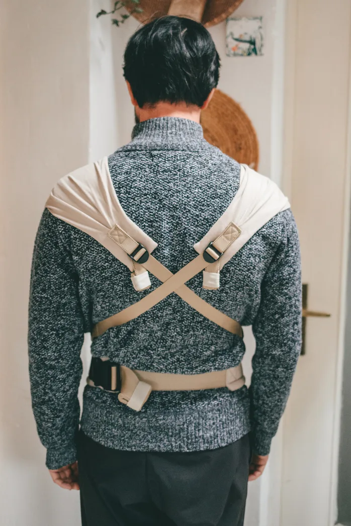 De schouderbanden kruis je op je rug en je maakt de schouderbanden vast aan de gespen op de tailleband of onder billen van je baby. De stof waaier je uit over je schouders voor een mooie gewichtsverdeling.