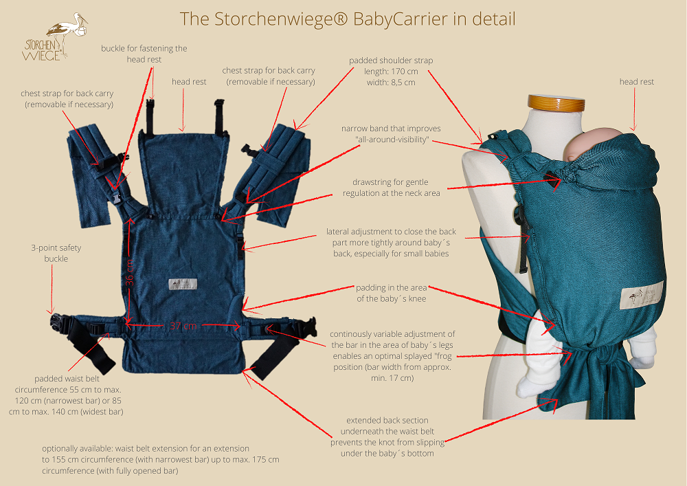 De Storchenwiege babycarrier is een babydrager, die vanaf de geboorte tot ca. 15 kilo gebruikt kan worden. Gemaakt van geweven draagdoekenstof en vormt zich mooi om de baby heen.